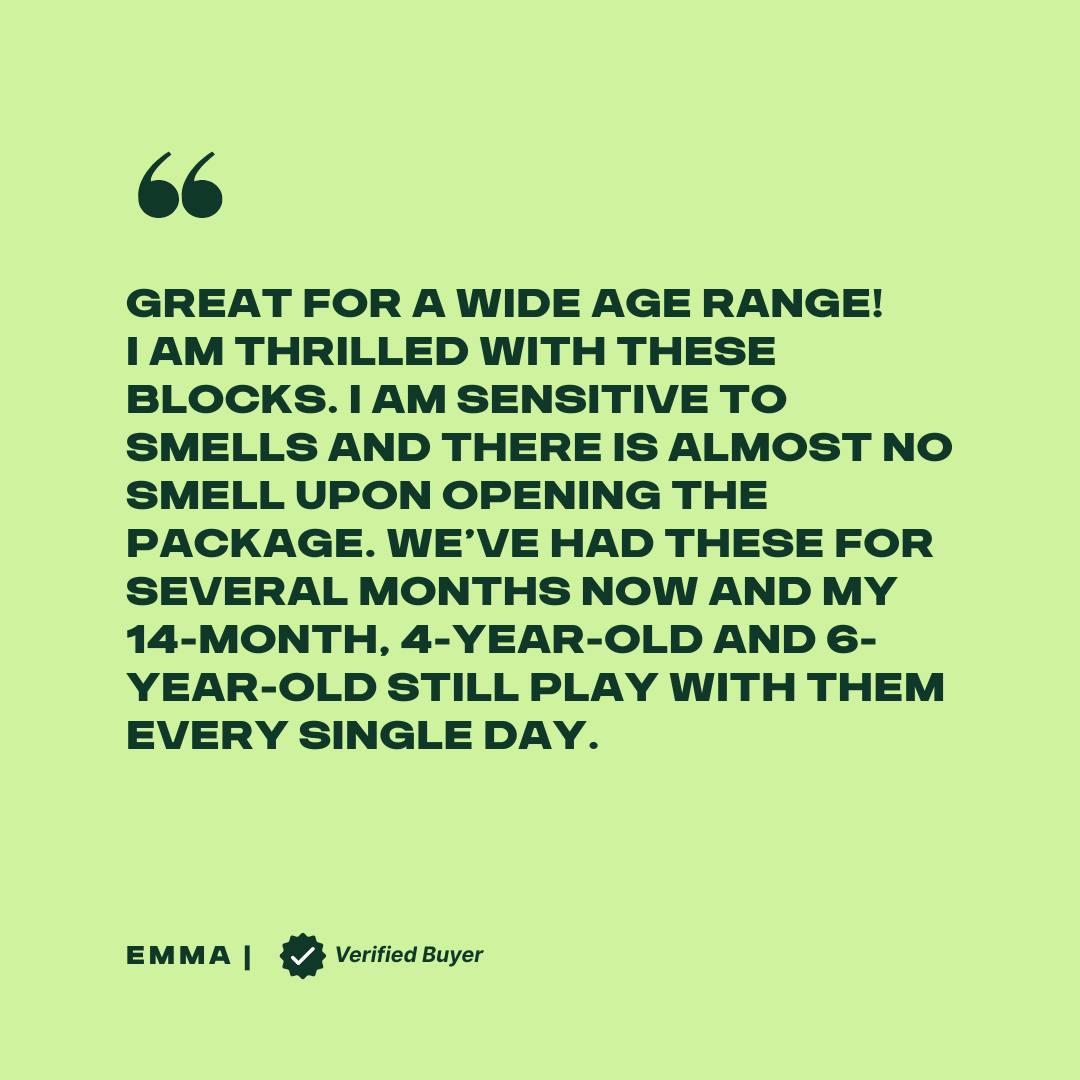 A: 6-18 months: safe mouthing and throwing, basic stacking. 18 months-3 years: building towers and simple structures. 3-6 years: creative castle scenarios and complex building projects. The blocks truly grow with your child's development.